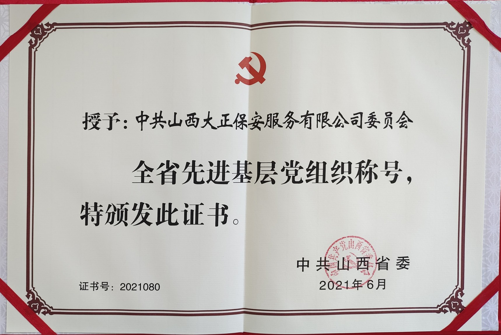 6月22日,在即將迎來中國共產(chǎn)黨百年華誕之際,山西省“兩優(yōu)一先”表彰大會在太原隆重召開。會上,中共山西大正保安服務集團有限公司委員會被中共山西省委授予“全省先進基層黨組織”榮譽稱號。會議以電視電話會議形式召開,集團公司黨委副書記、副總經(jīng)理陳志平代表集團公司黨委在忻州分會場參會并領取獎牌及榮譽證書。