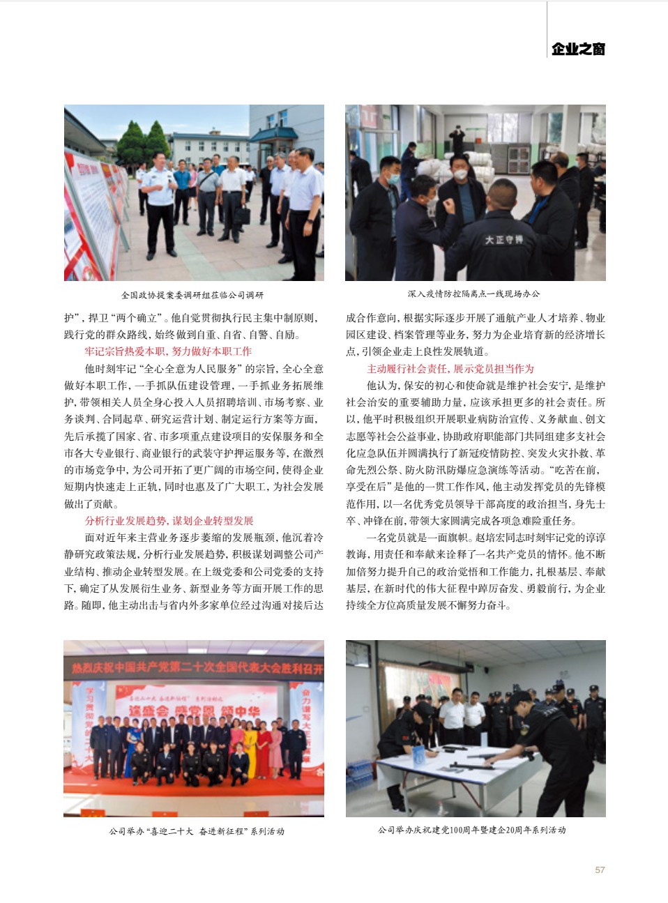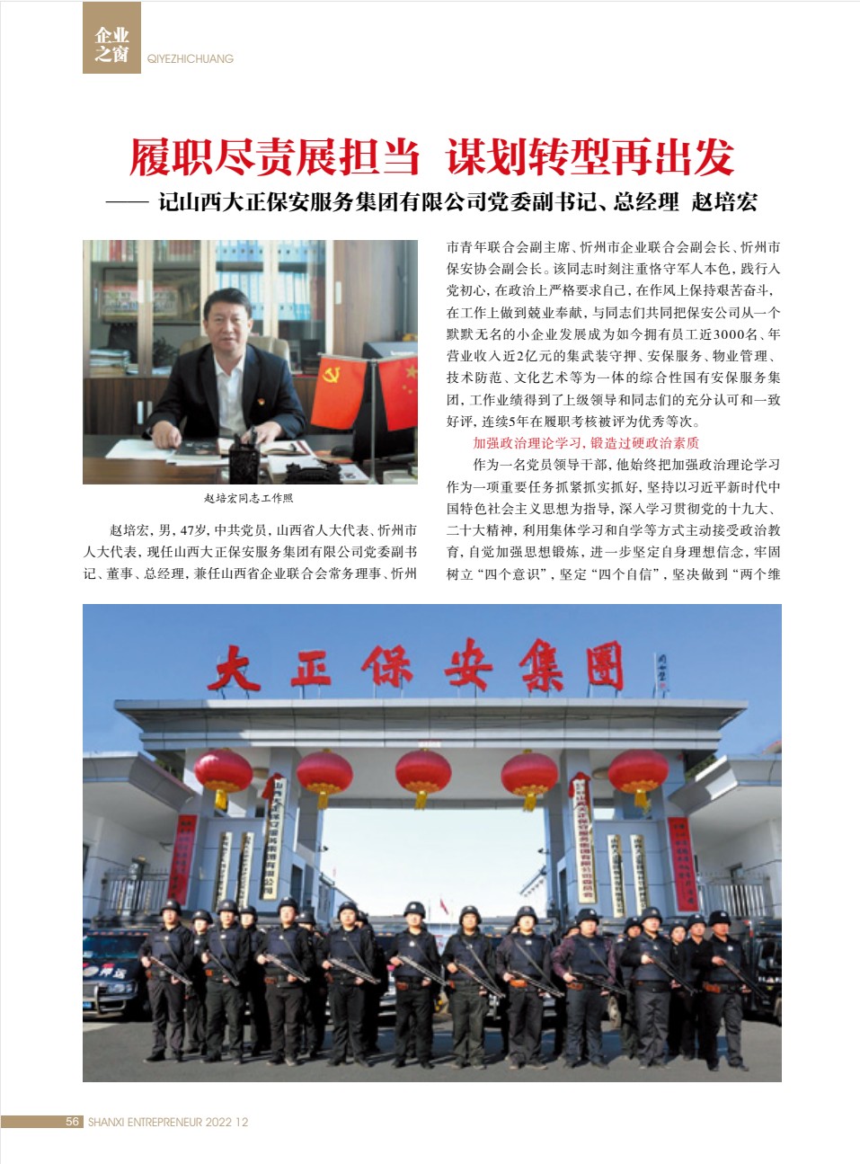 近日,《山西企業(yè)家》雜志第40期(2022年12月號(hào))以《履職盡責(zé)展擔(dān)當(dāng)謀劃轉(zhuǎn)型再出發(fā)》為題,刊發(fā)了對山西大正保安服務(wù)集團(tuán)有限公司黨委副書記、總經(jīng)理趙培宏的專題報(bào)道: