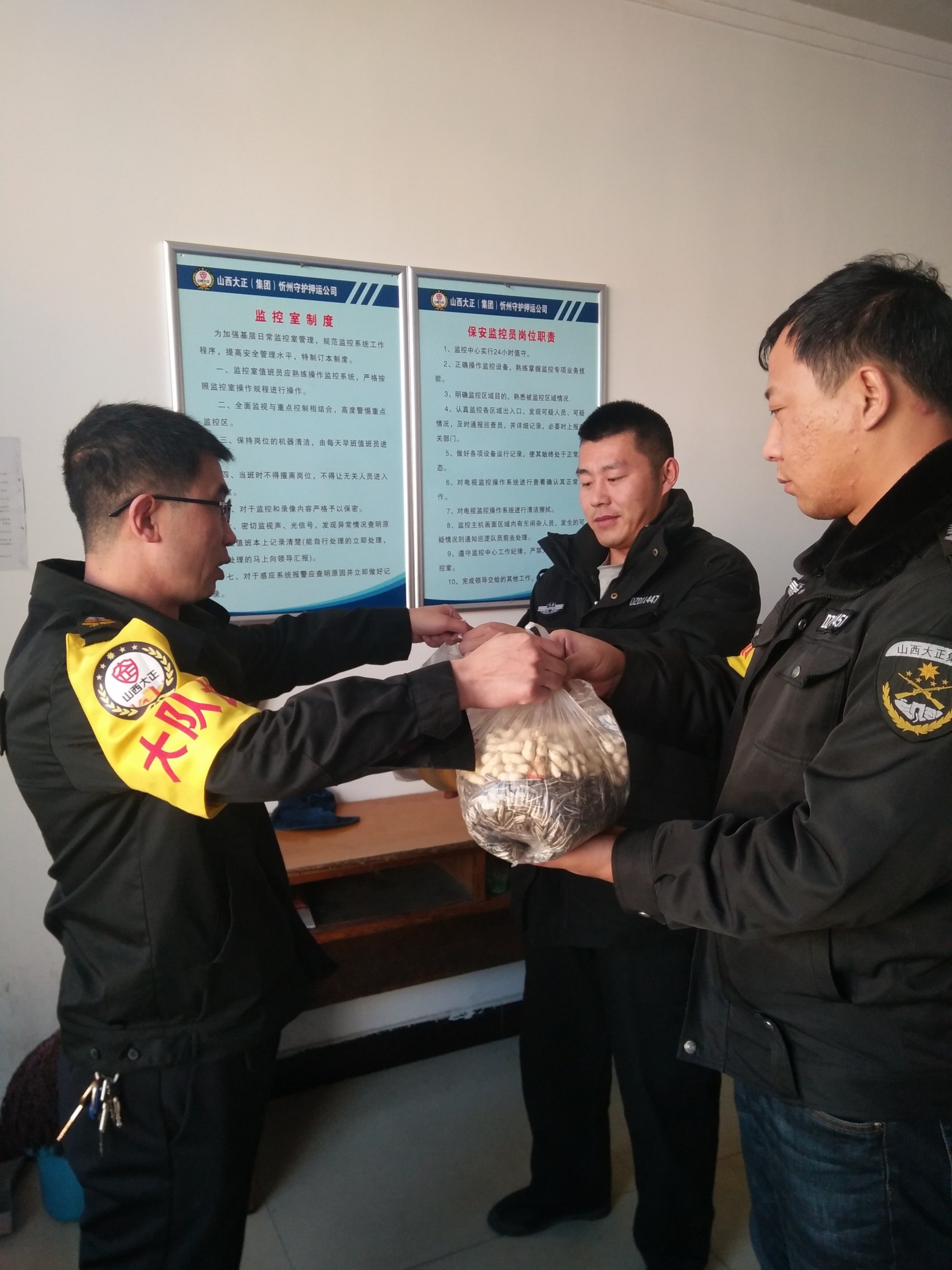 在全市人民群眾歡度新春佳節(jié)之際,山西大正保安服務(wù)有限公司全體守押人員依然戰(zhàn)斗值守在保安全、保穩(wěn)定工作一線,以飽滿的工作熱情和高度負(fù)責(zé)的工作態(tài)度,努力營造了歡樂、祥和、平安的節(jié)日氛圍,確保了全市春節(jié)期間社會(huì)治安穩(wěn)定,為群眾歡度春節(jié)提供了堅(jiān)強(qiáng)有力地安全保障,以實(shí)際行動(dòng)證明,山西大正是客戶單位值得信賴的守押隊(duì)伍。