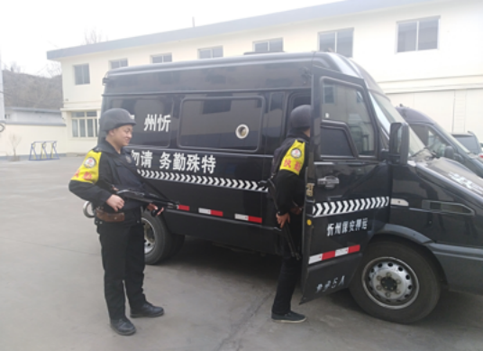 圖為:守押繁峙中隊(duì)押運(yùn)員在執(zhí)行任務(wù)中