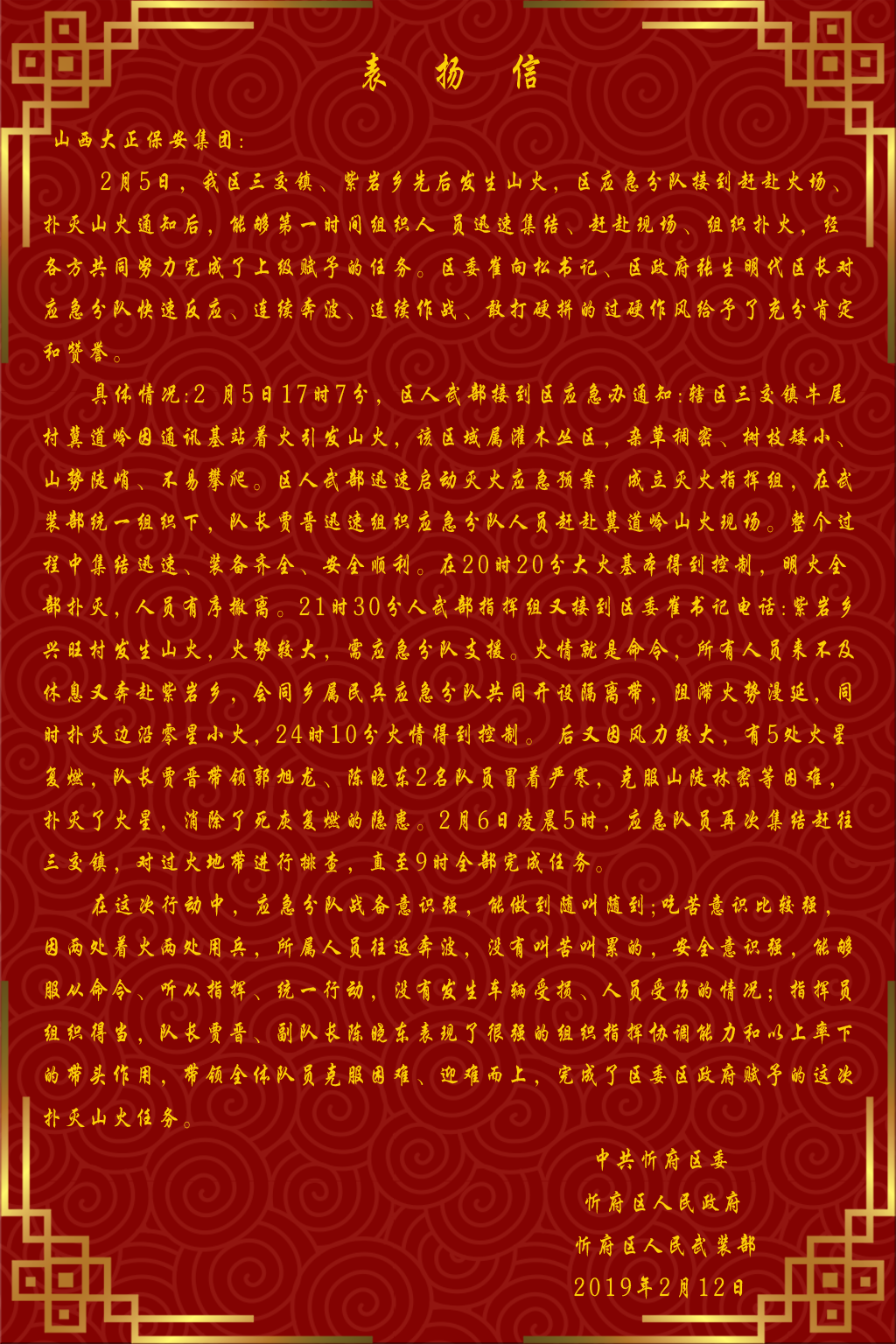 另外,2月5日,忻府區(qū)三交鎮(zhèn)、紫巖鄉(xiāng)先后發(fā)生山火,區(qū)應(yīng)急分隊(duì)接到趕赴火場、撲滅山火通知后,公司在第一時(shí)間組織應(yīng)急人員迅速集結(jié)、趕赴現(xiàn)場、組織撲火,全體隊(duì)員攻堅(jiān)克難、英勇奮戰(zhàn)、連續(xù)奔波、連續(xù)作戰(zhàn),經(jīng)各方共同努力圓滿完成了上級賦予的滅火任務(wù),得到了忻府區(qū)委崔向松書記、張生明代區(qū)長的充分肯定和贊譽(yù)。此外,中共忻府區(qū)委,忻府區(qū)人民政府,忻府區(qū)人民武裝部專程來公司送來表揚(yáng)信,對公司應(yīng)急隊(duì)伍完成此次救火任務(wù),展示了公司隊(duì)伍良好形象進(jìn)行了表揚(yáng)。