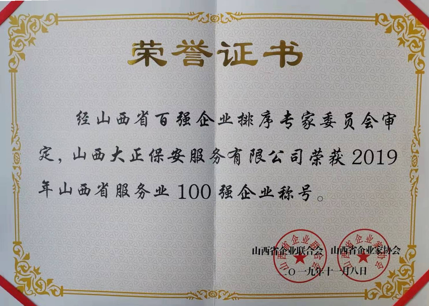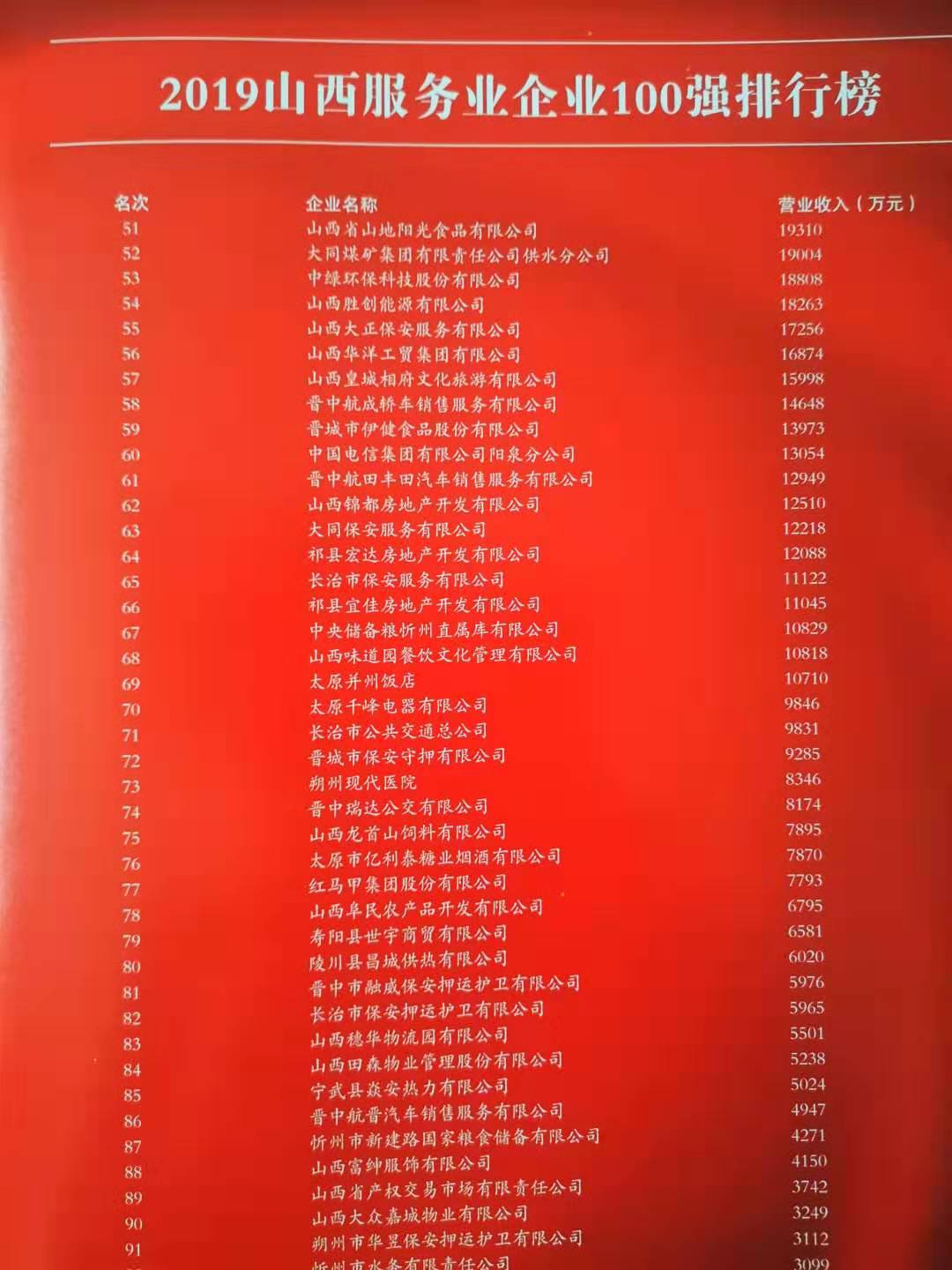 11月8日,2019山西企業(yè)100強在省城太原發(fā)布。經(jīng)山西省百強企業(yè)排序?qū)<椅瘑T會審定,山西大正保安服務(wù)有限公司再次榮獲“山西省服務(wù)業(yè)100強企業(yè)”,這是該公司自2014年以來連續(xù)五次榮登該榜。公司黨委副書記、副總經(jīng)理陳志平前往參會。
