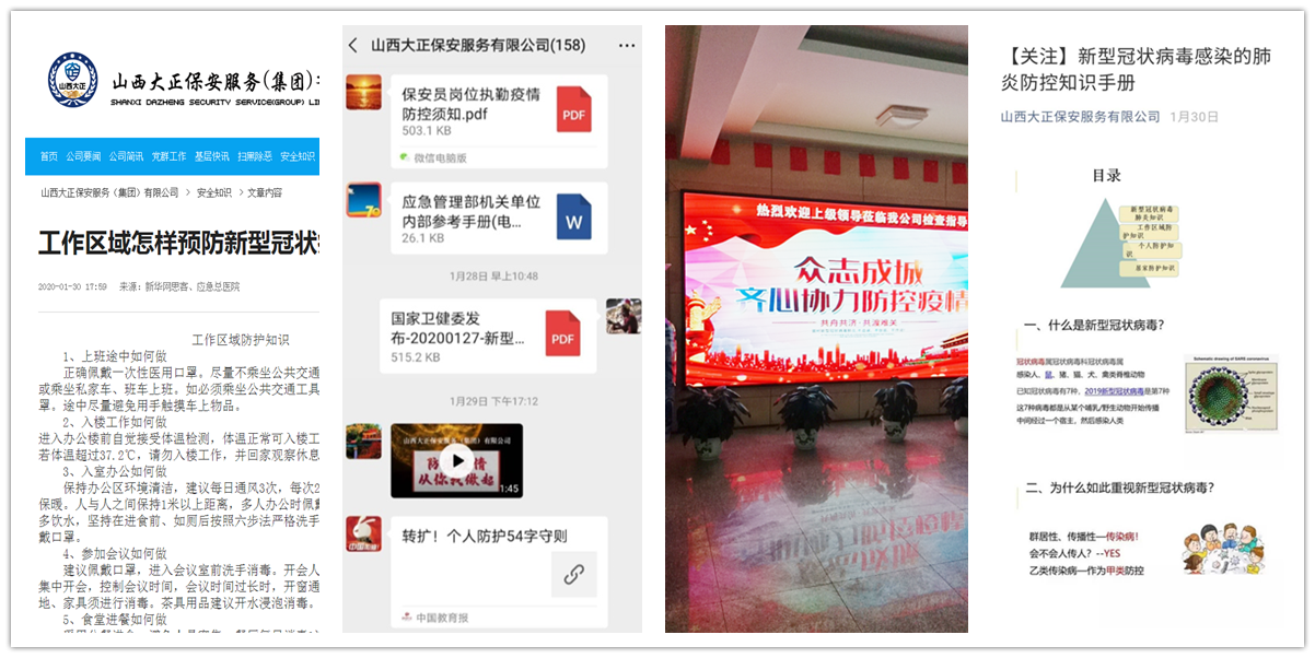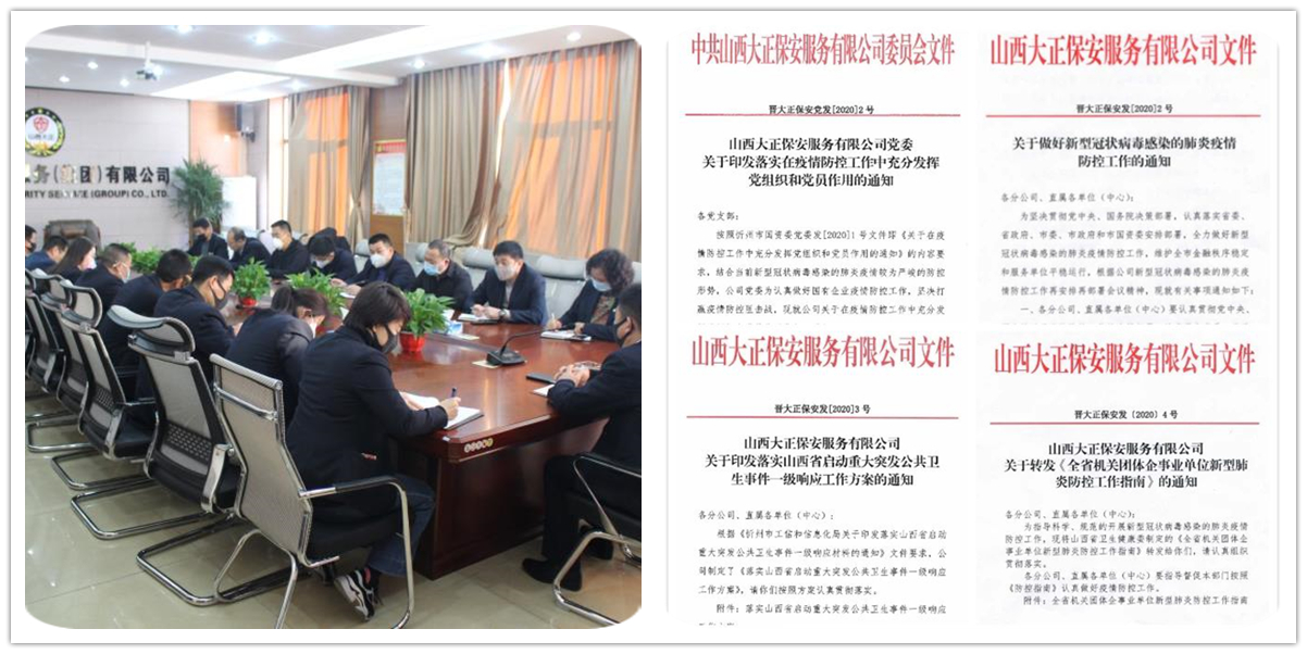 新型冠狀病毒肺炎疫情爆發(fā)以來,山西大正保安服務(wù)有限公司堅(jiān)決貫徹黨中央、國務(wù)院決策部署,深入貫徹省委、省政府,市委、市政府和市國資委安排部署,認(rèn)真落實(shí)“堅(jiān)定信心、同舟共濟(jì)、科學(xué)防治、精準(zhǔn)施策”的總要求,根據(jù)企業(yè)實(shí)際情況周密安排部署,多措并舉扎實(shí)推進(jìn)企業(yè)疫情防控工作。