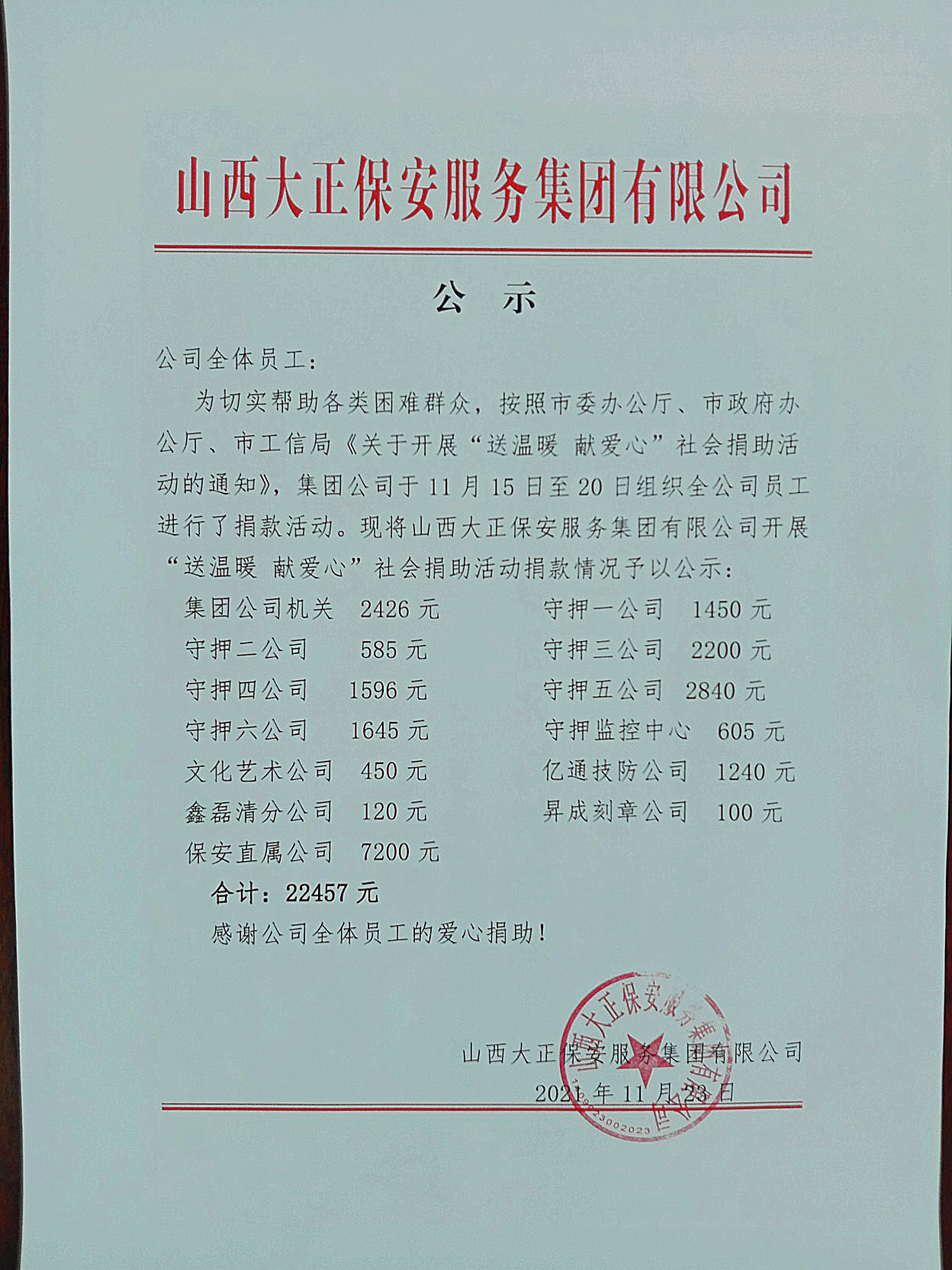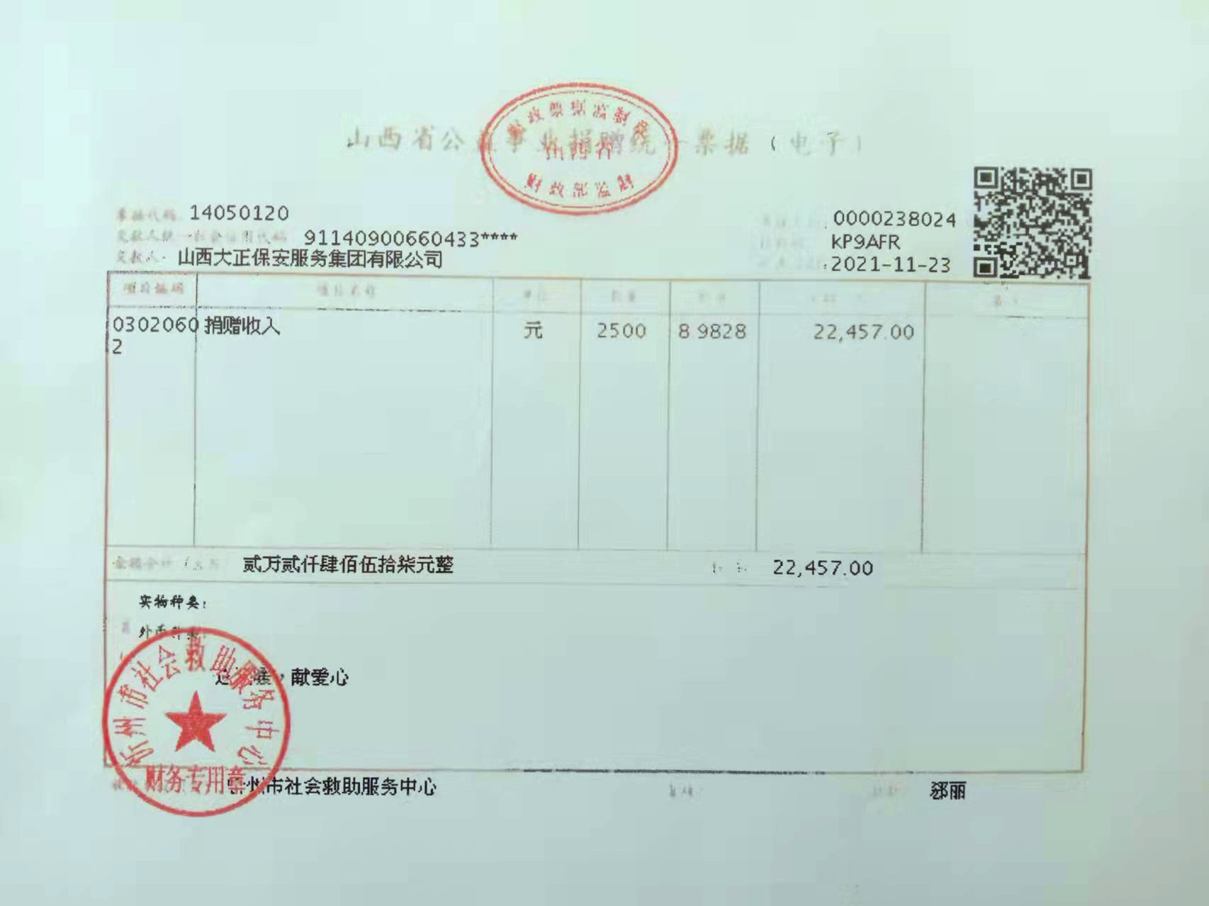 與此同時,公司基層各級黨組織和黨員領(lǐng)導(dǎo)干部充分發(fā)揮表率作用,帶頭宣傳動員,帶頭捐款獻愛心,以實際行動影響和帶動廣大干部職工在各所屬駐地相繼踴躍開展、參與了捐助活動。一筆筆捐款,代表著山西大正保安集團廣大職工的一份份愛心,詮釋著大正保安人對社會的拳拳愛心,短短幾天時間,我公司共收到員工社會捐款22457元。
