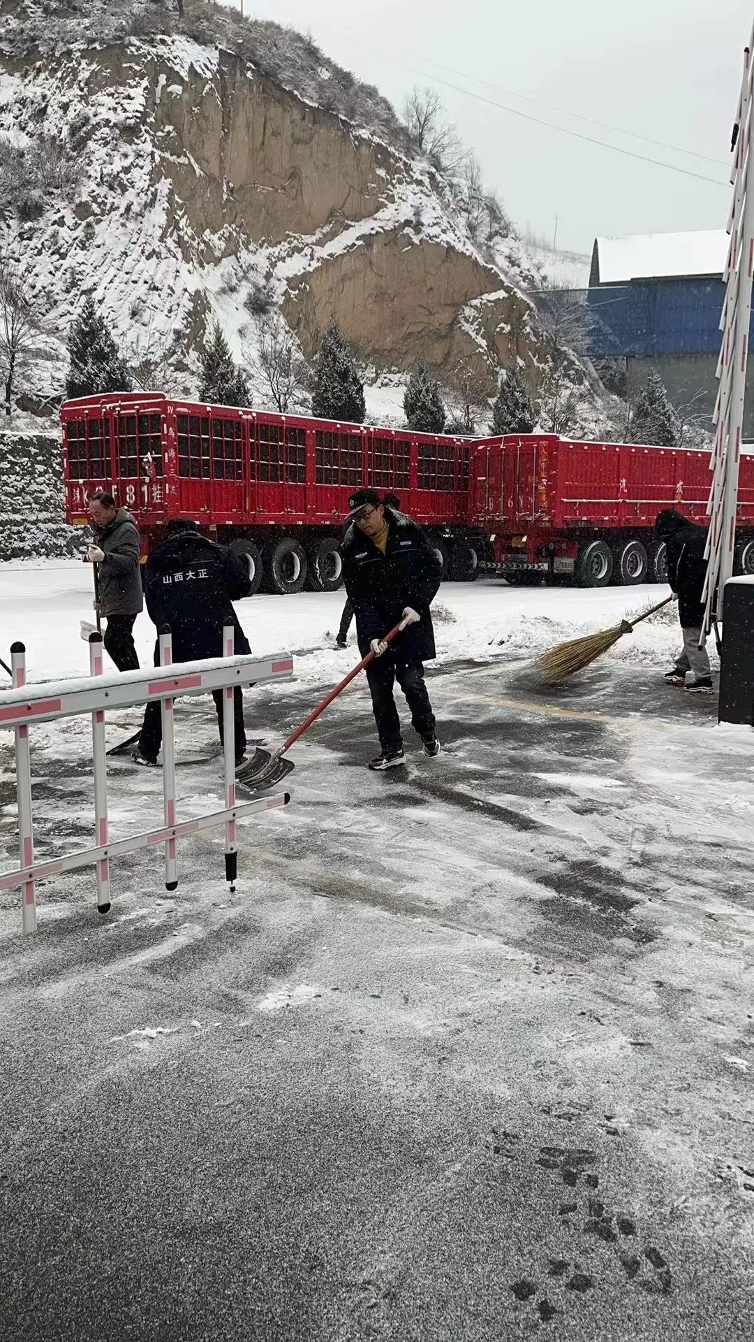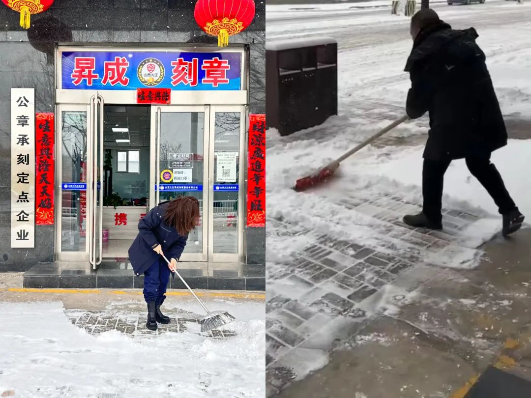 各子(分)公司也在第一時(shí)間清掃辦公區(qū)域及周邊的積雪,大家不顧天寒路滑,揮舞著鐵鍬和掃帚,你鏟我掃,分工明確、相互配合,呈現(xiàn)出一派“通力協(xié)作保暢通,熱火朝天掃雪忙”的景象。在隊(duì)員們共同努力下,為客戶單位的工作人員出行提供了更加便利、更加安全的環(huán)境,并獲得了客戶單位的認(rèn)可及贊許。