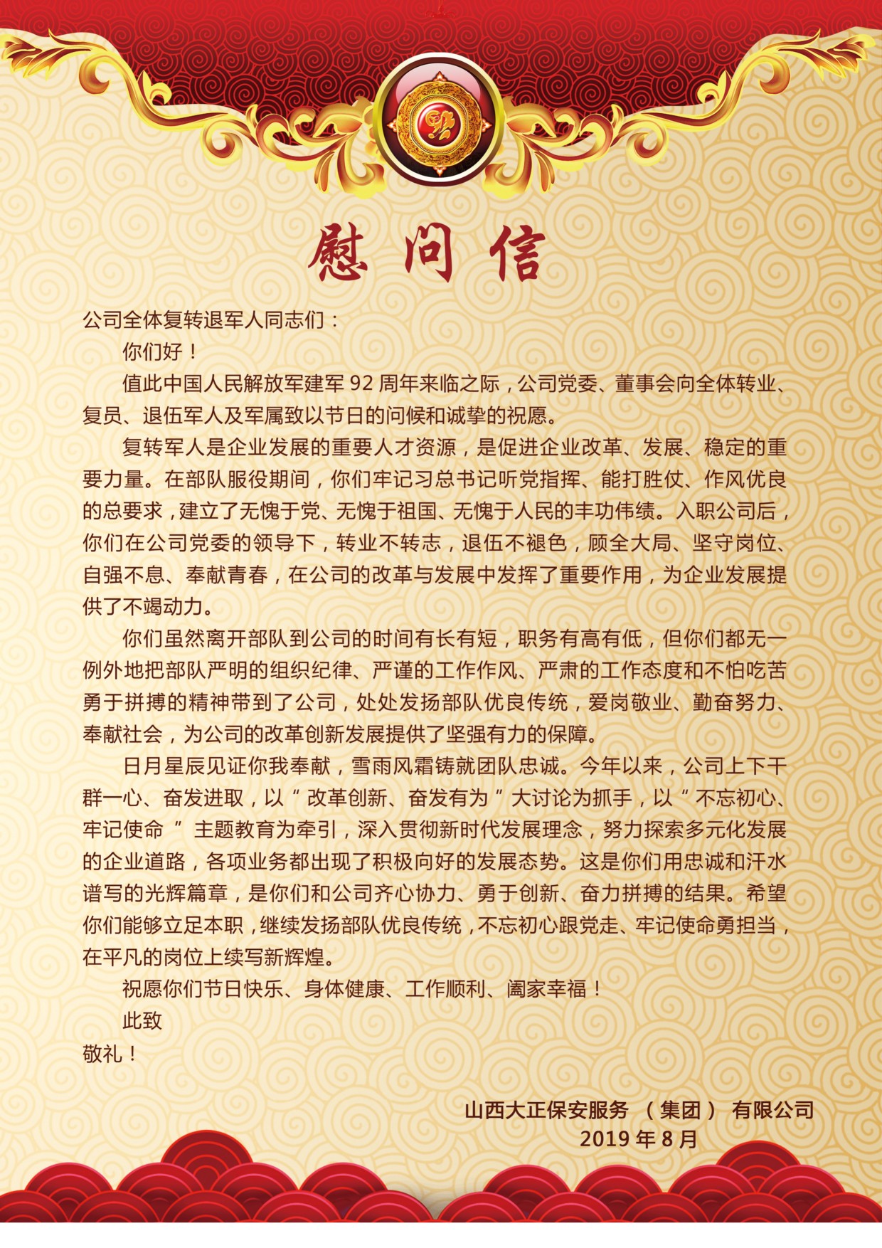 黨委委員、副總經理趙培宏宣讀《慰問信》,信中談到:公司的每位復轉軍人都是企業(yè)發(fā)展的重要人才資源,是促進企業(yè)改革、發(fā)展、穩(wěn)定的重要力量,處處發(fā)揚著部隊優(yōu)良傳統,為公司的改革創(chuàng)新發(fā)展提供了堅強有力的保障。希望大家能夠以“改革創(chuàng)新、奮發(fā)有為”大討論為抓手,以“不忘初心、牢記使命”主題教育為牽引,立足本職,發(fā)揚部隊優(yōu)良傳統,不忘初心跟黨走、牢記使命勇擔當,在平凡的崗位上續(xù)寫新輝煌。