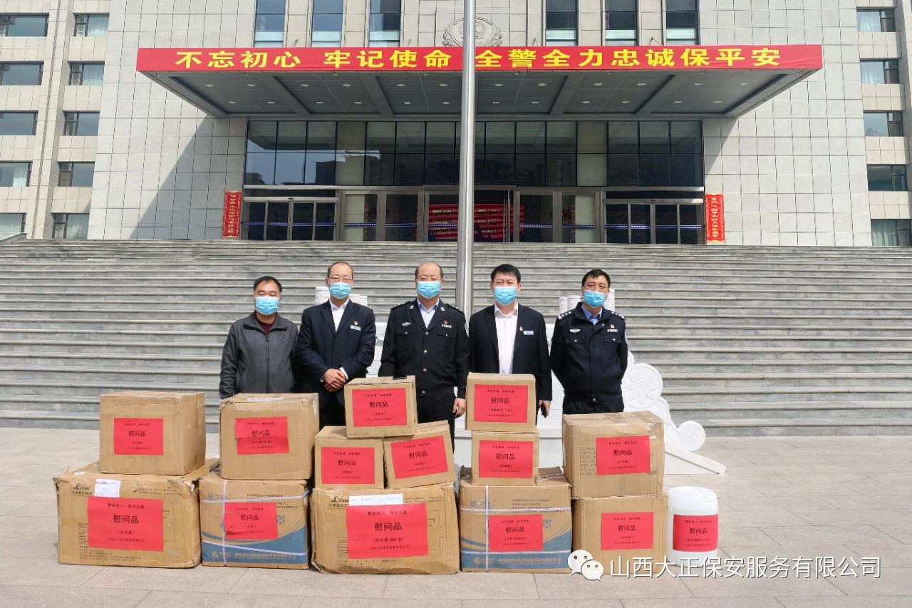 3月31日,山西大正保安服務(wù)(集團)有限公司黨委委員、副總經(jīng)理趙培宏、副總經(jīng)理王明生領(lǐng)導(dǎo)一行,專程來到市公安局,捐贈了醫(yī)用口罩12000、防護服200套、護目鏡500個、消毒液80㎏、醫(yī)用酒精25㎏,表達公司和干部職工對公安民警疫情防控的支持;對警保同心、聯(lián)手抗疫的信心、決心;對廣大公安民警健康的關(guān)愛。忻州市公安局副局長王雷接過物資后,代表市局對大正集團公司的捐贈表示感謝。