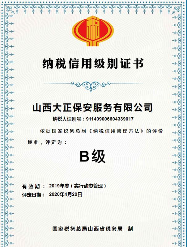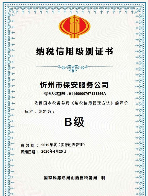 近日,山西大正保安服務(wù)有限公司和忻州市保安服務(wù)公司在國家稅務(wù)局忻州市經(jīng)濟技術(shù)開發(fā)區(qū)分局的2019年度納稅信用級別評定工作中分別獲得納稅信用等級“B級”評定。