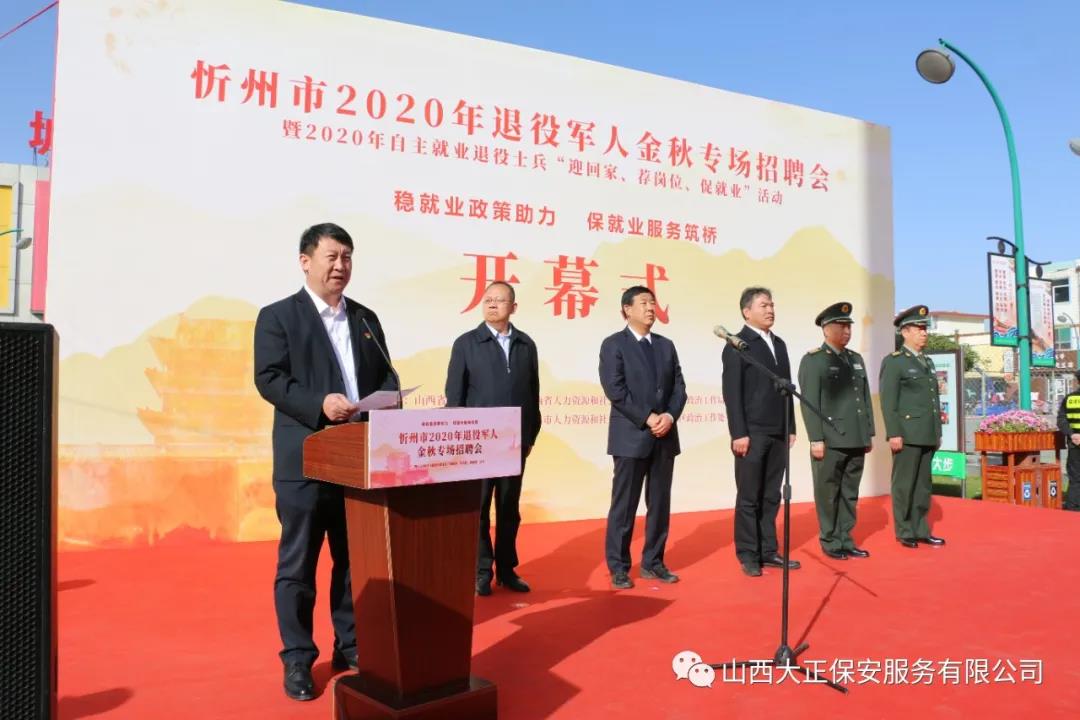 10月21日,由山西省退役軍人事務廳、山西省人力資源和社會保障廳、山西省軍區(qū)政治工作局主辦,忻州市退役軍人事務局、忻州市人力資源和社會保障局、山西省忻州軍分區(qū)承辦的忻州市2020年退役軍人金秋專場招聘會于忻州體育廣場舉行,活動以“穩(wěn)就業(yè)政策助力,保就業(yè)服務筑橋”為主題。山西大正保安服務集團有限公司總經(jīng)理趙培宏作為參會企業(yè)代表上臺發(fā)言,集團公司人力資源中心工作人員在現(xiàn)場開展招聘活動。