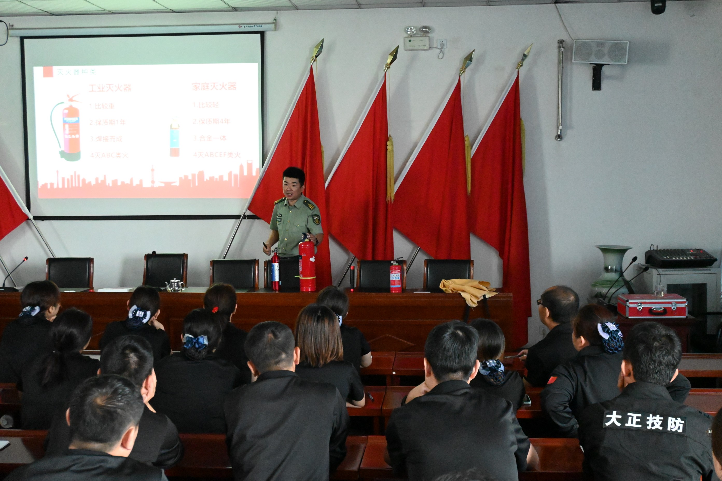 培訓(xùn)課上,張教官從火災(zāi)定義、火災(zāi)種類、滅火工具、防范措施幾方面現(xiàn)場(chǎng)教學(xué),通過視頻播放的方式,以觸目驚心的火災(zāi)案例警示短片,向大家展示了建筑、倉庫、公共場(chǎng)所、車輛、居家等區(qū)域的消防安全隱患,給大家敲響消防安全警鐘。其次是對(duì)日常生活中和公共聚集場(chǎng)所的防火安全知識(shí)做了詳細(xì)的介紹,同時(shí)還對(duì)滅火器的選擇與使用以及火場(chǎng)應(yīng)急措施與逃生進(jìn)行了全面的講解。