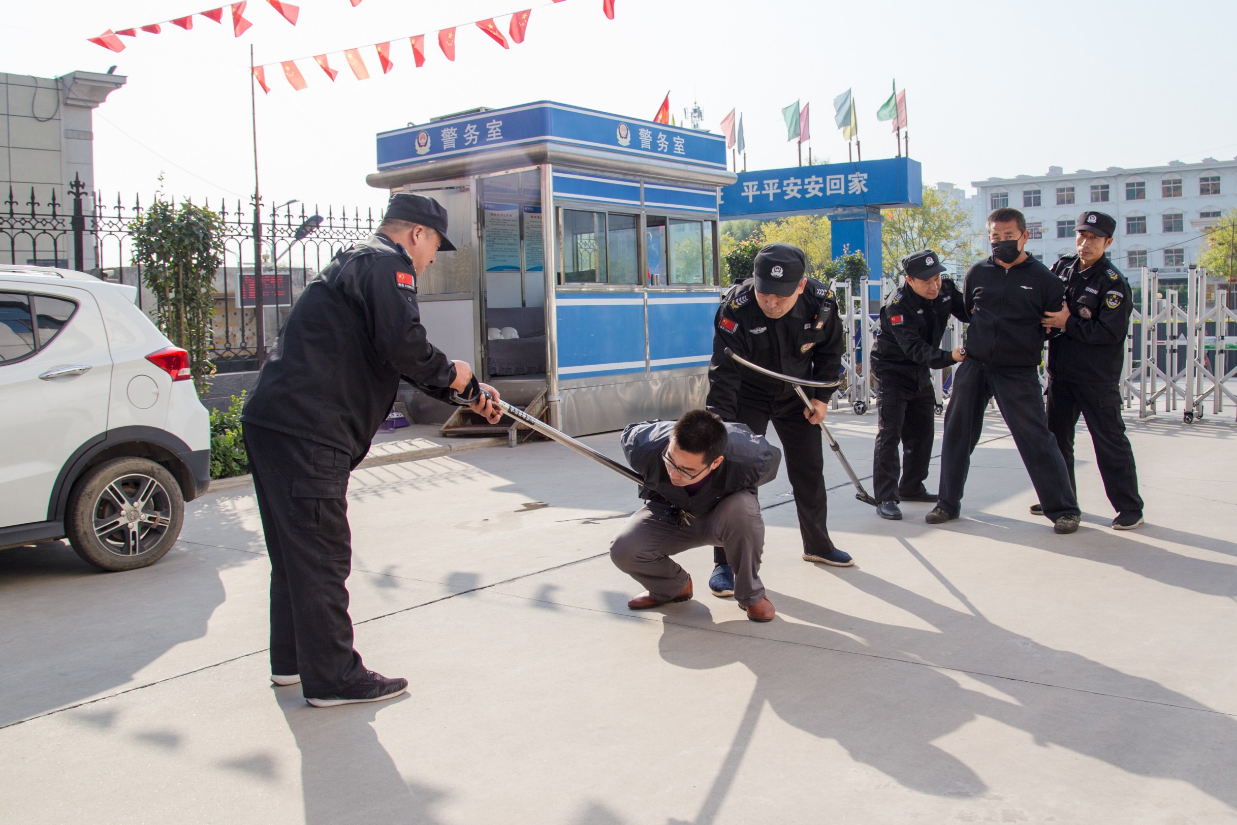 演練開始后,路邊車上下來(lái)四名歹徒,手持棍棒沖向大門,門衛(wèi)及時(shí)關(guān)閉大門,并用對(duì)講機(jī)呼叫執(zhí)勤保安,各小組收到信息后,手持防爆工具及時(shí)趕赴現(xiàn)場(chǎng),互相配合,大家齊心協(xié)力把歹徒制服。